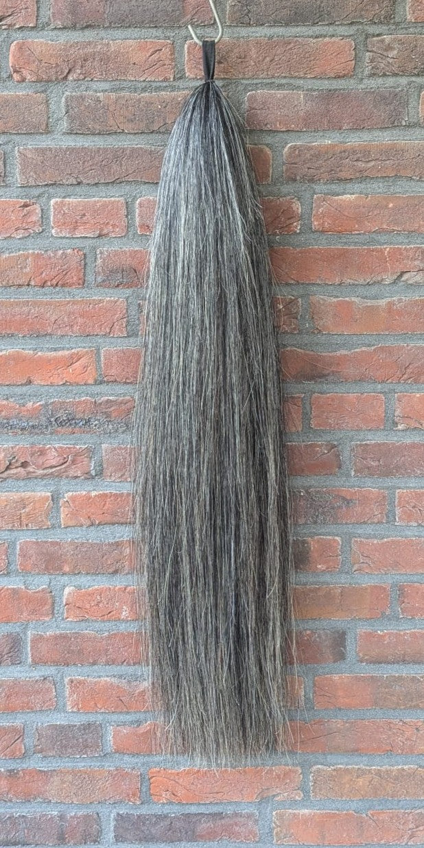 De kleur van deze staart is natuurlijk zwart. Dit betekent dat de staart niet is geverfd maar dat er wat bruine haren tussen zitten en dat de onderkant iets bruin is.