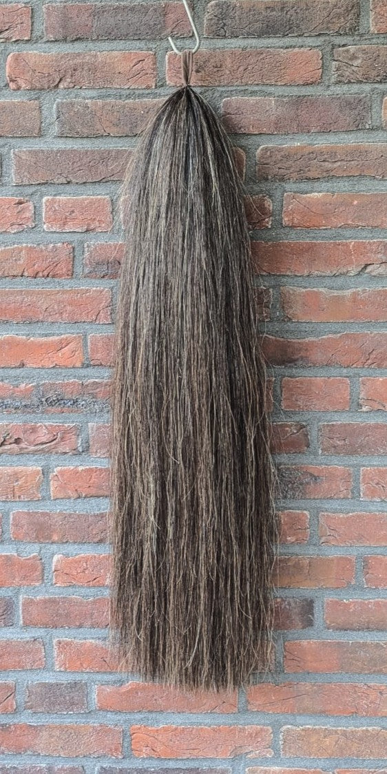 De kleur van deze staart is natuurlijk zwart. Dit betekent dat de staart niet is geverfd maar dat er wat bruine haren tussen zitten en dat de onderkant iets bruin is.
